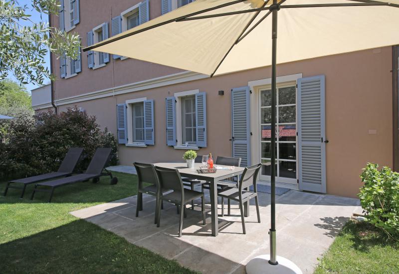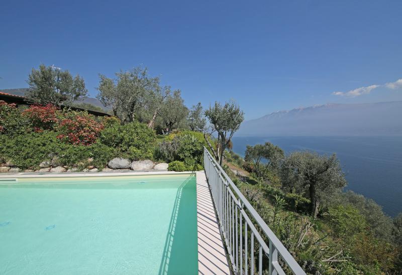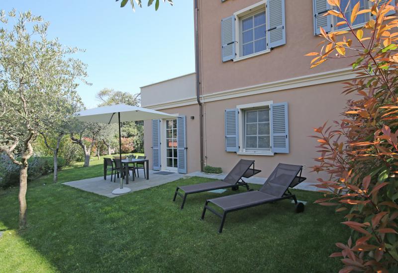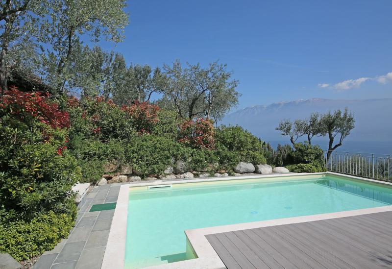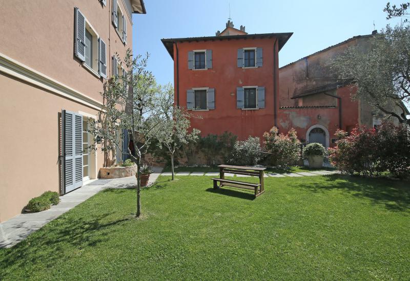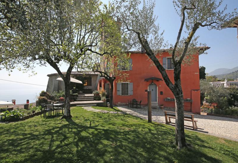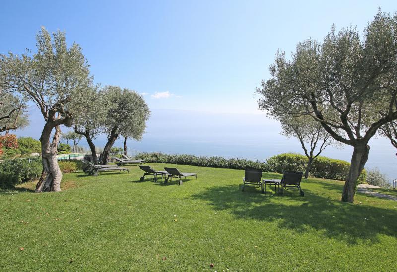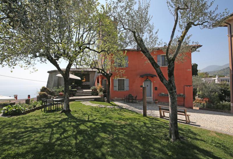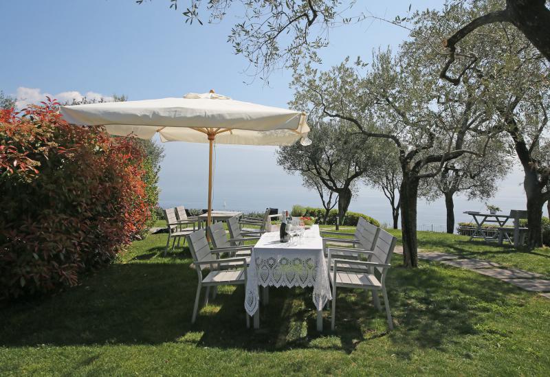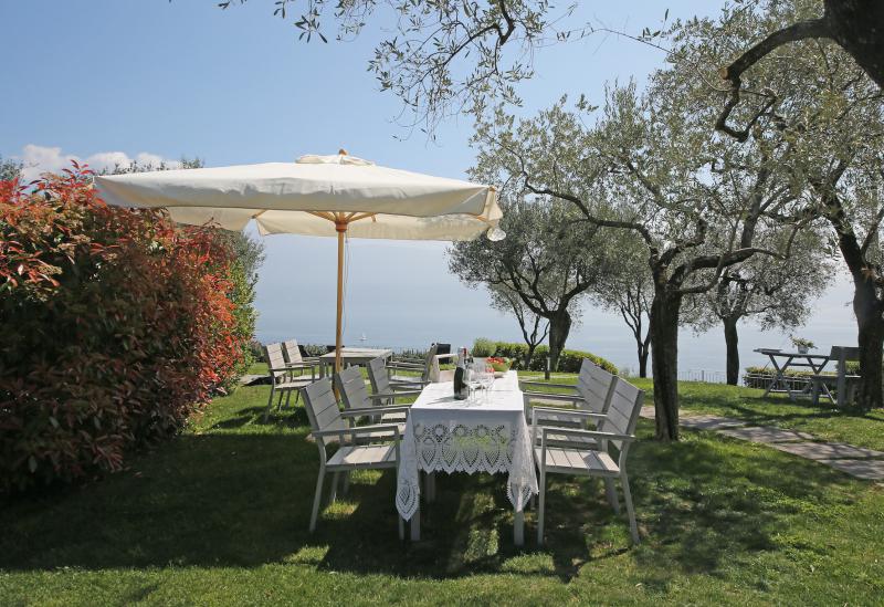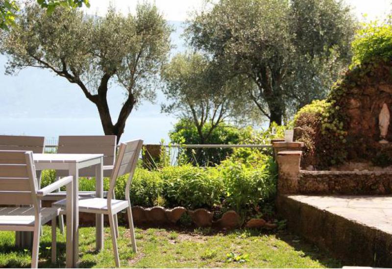 De tuin van de villa is mooi aangelegd met oude olijfbomen en er is een zwembad (niet zo groot) met ligbedjes. Aan de rand van de tuin hebben ze een zonneterras met bedjes van waar je in alle rust kunt genieten van het uitzicht op het Gardameer. Aan de andere kant van de agriturismo kijk je uit op de prachtig gelegen 18 holes golfbaan met bar en restaurant. Verder biedt de agriturismo broodservice. U bestelt de avond ervoor de broodjes die u wilt en dan staan deze s'ochtends voor u klaar.