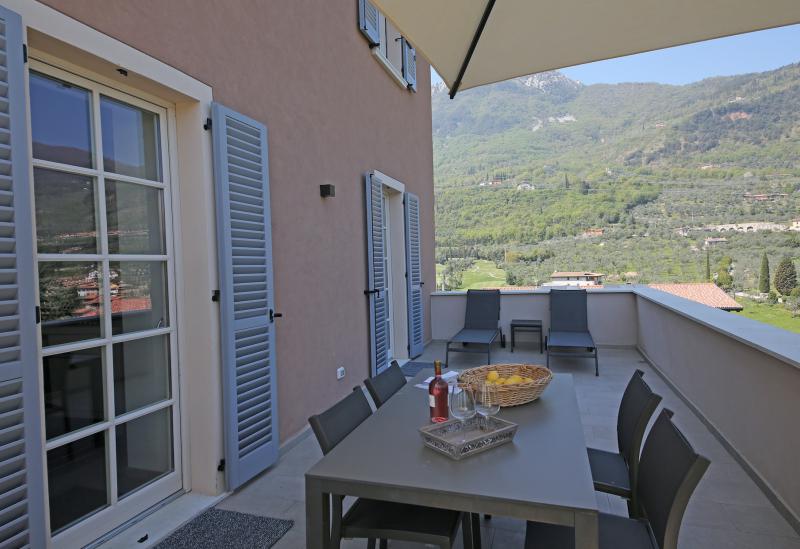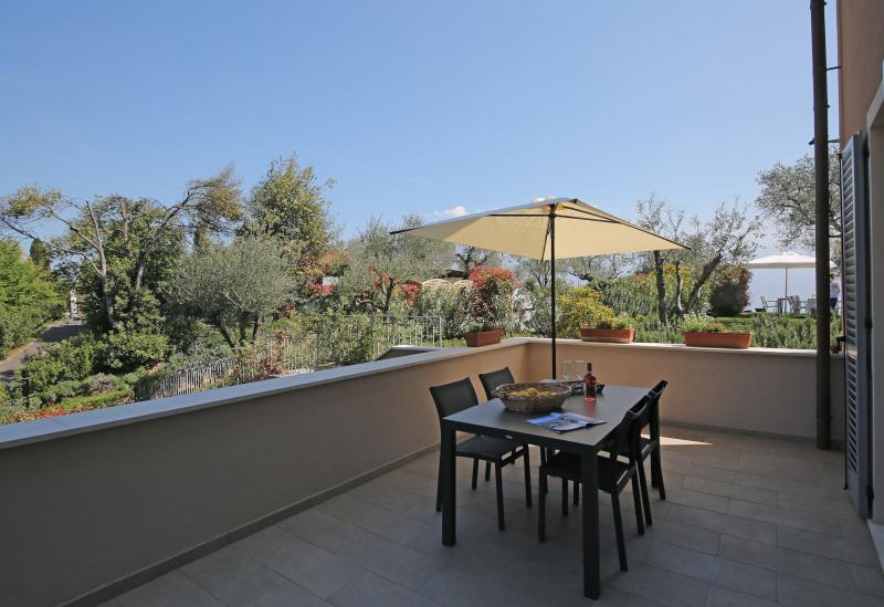 Vanaf de weg die rond het Gardameer loopt is het een klein eindje omhoog de berg op en je bent bij de agriturismo. Wat meteen opvalt is het prachtige uitzicht op het meer en de besneeuwde bergen, ik was er in het voorjaar, aan de overkant. Ondanks dat het meer niet ver weg is, is het bij de agriturismo aangenaam rustig. Aan de andere kant van de agriturismo heb je mooi uitzicht over een panoramisch gelegen golfbaan.
