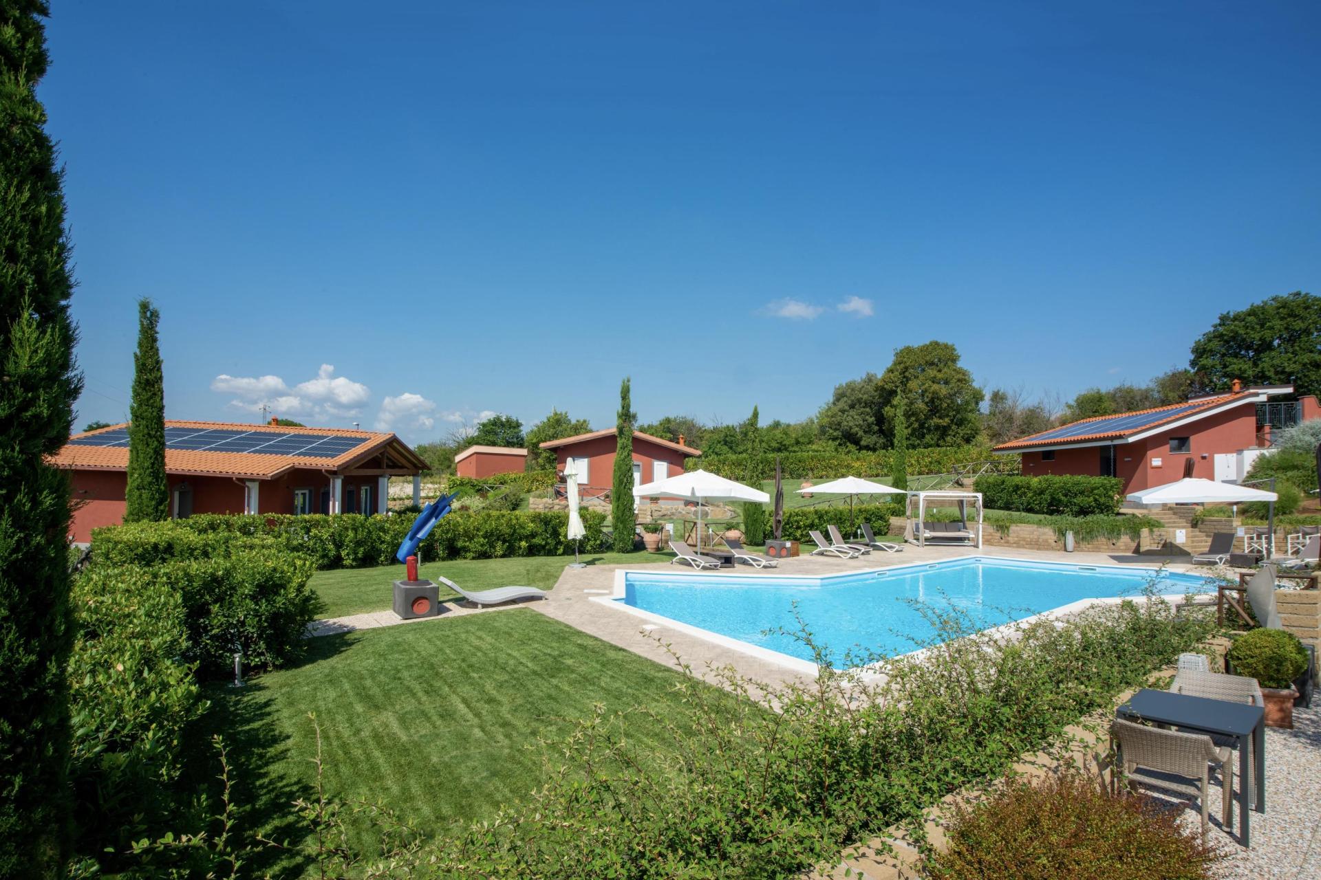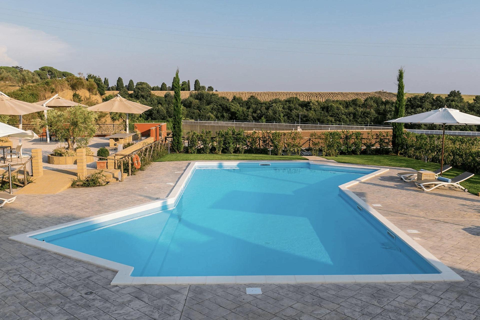 Het mooie zwembad ligt te midden van olijfbomen en wijngaarden. Rondom het zwembad staan parasols met comfortabele ligbedjes. 's Zomers kun je bij de kleine poolbar een verfrissend drankje krijgen. Er is ook een terras dat een adembenemend uitzicht opr het omliggende landschap biedt.